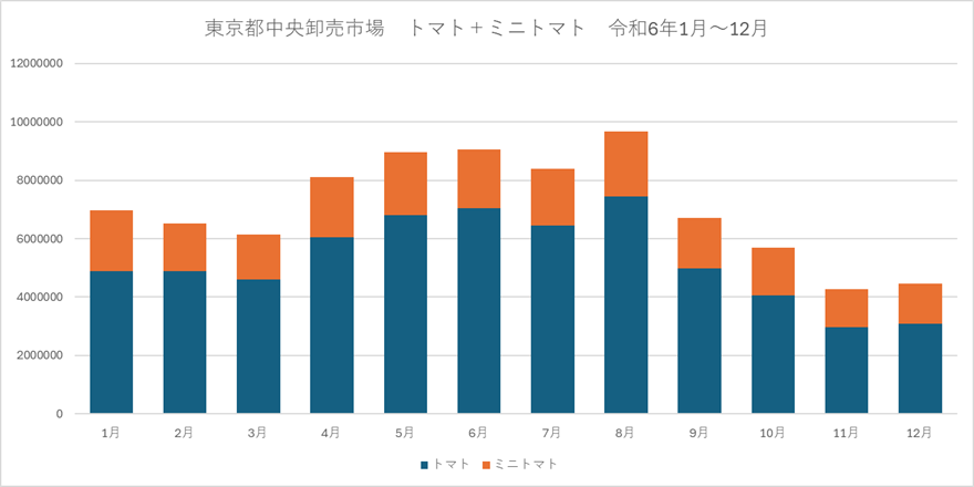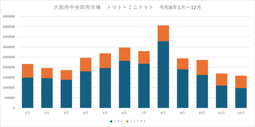 トマトはビニールハウスなどで栽培されることも多いので、通年での入手が可能です。ただし、令和6年の東京都中央卸売市場および大阪中央卸売市場のトマト(ミニトマト含む)の入荷傾向を見ると、いずれも4月~8月頃が多く、8月がピークということがわかります。ミニトマトが占める割合は、季節によって変動していないイメージです(図)。