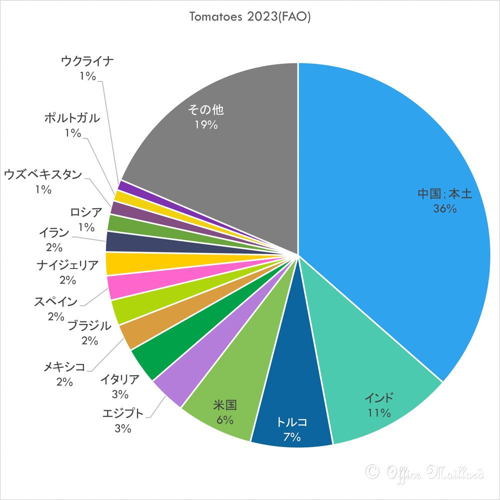 国際連合食糧農業機関(Food of Agriculture Organization:FAO)の統計によると、2023年のトマトの世界総生産量は約1億8,900万トン*。最も多かったのは中国本土で約7,012万トン(全体の約36%)。2位はインドで約2,043万トン、3位がトルコで約1,330万トンでした。日本は31位でした*。