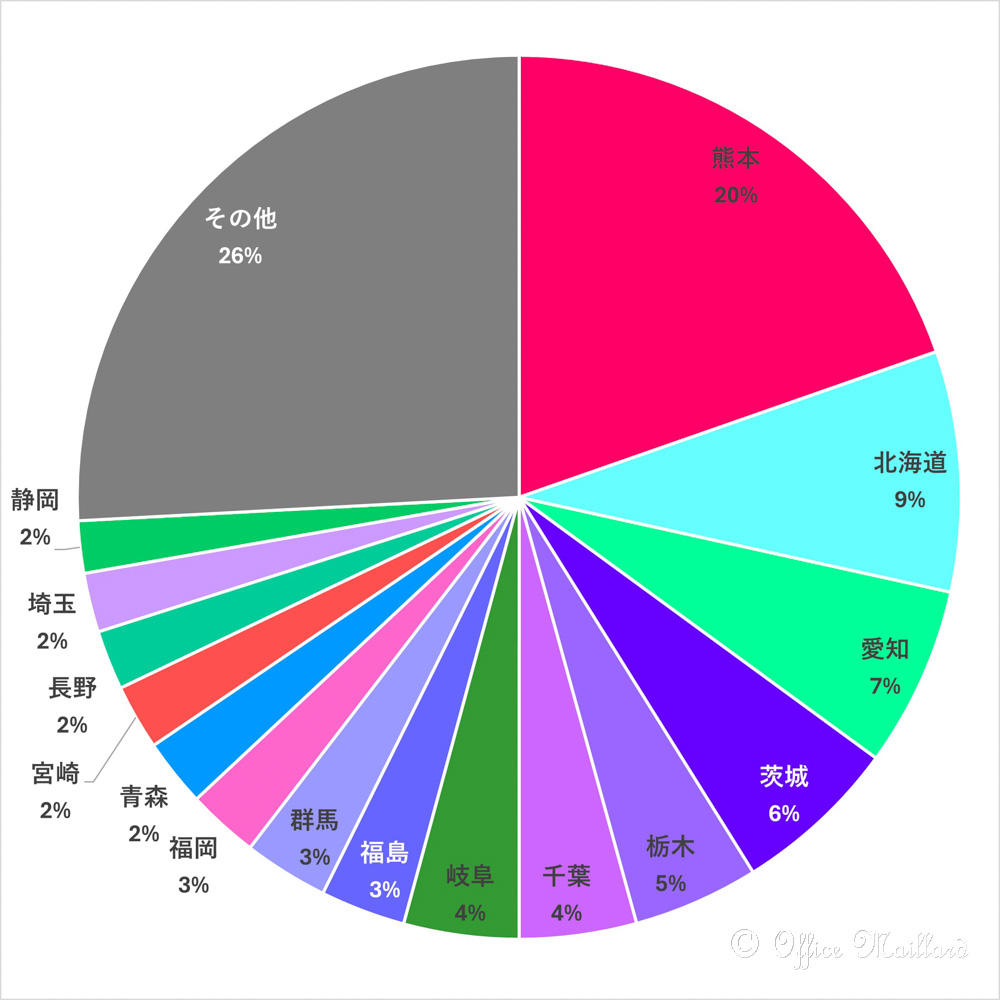 日本における令和5年度のトマトの総収穫量は約68万1,400トンでした。都道府県別では熊本県がトップで13万2,600トン、全体の約20%を占めていました。次いで北海道(9%)、愛知県(7%)、茨城県(6%)、栃木県(5%)と続きました。グラフ中のその他(16位以下)は下表をご参照ください*。