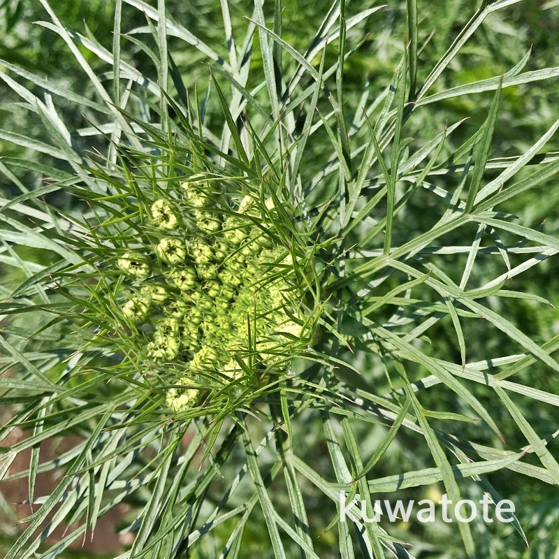 伸びた茎の先端に、セリ科特有の傘状の白い花が咲きます。その姿は、野に咲くレースフラワーのようで、普段見慣れたにんじんからは想像もつかない美しさです。
