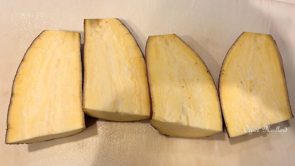 通常のサツマイモのデンプンが糊化されるのは約70℃。酵素もこの温度帯で活性化しますが、75~80℃になると失活します。そのため、加熱して70~75℃の温度帯に滞在する時間が長ければ糖の生成量が多くなります*。サツマイモは低温でじっくり焼くと甘くおいしくなる、と言われるのにはこのような理由があります。