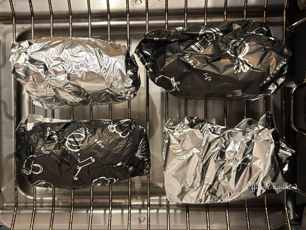 焦げ目がやや強く出たことを考えると、黒ホイルならより短時間に仕上がったのかもしれません。時短というのがポイントなので、味よりも、仕上がり時間を優先的に比較すべきだったなあ、と焼いてみてから気づいた次第です。