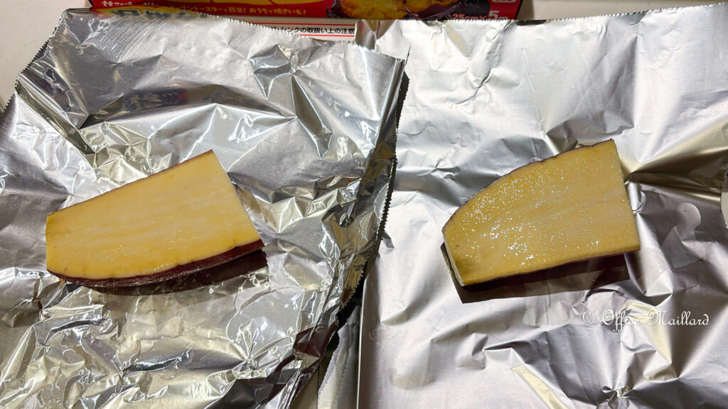 ということで、黒ホイルはパッケージにあるとおり、内部の温度上昇が定番ホイルより早い感じはありました。早く糊化して酵素が働き、早く焼き上がる。さらに温度も高めの熱々焼きいもに仕上がる、といった印象です。