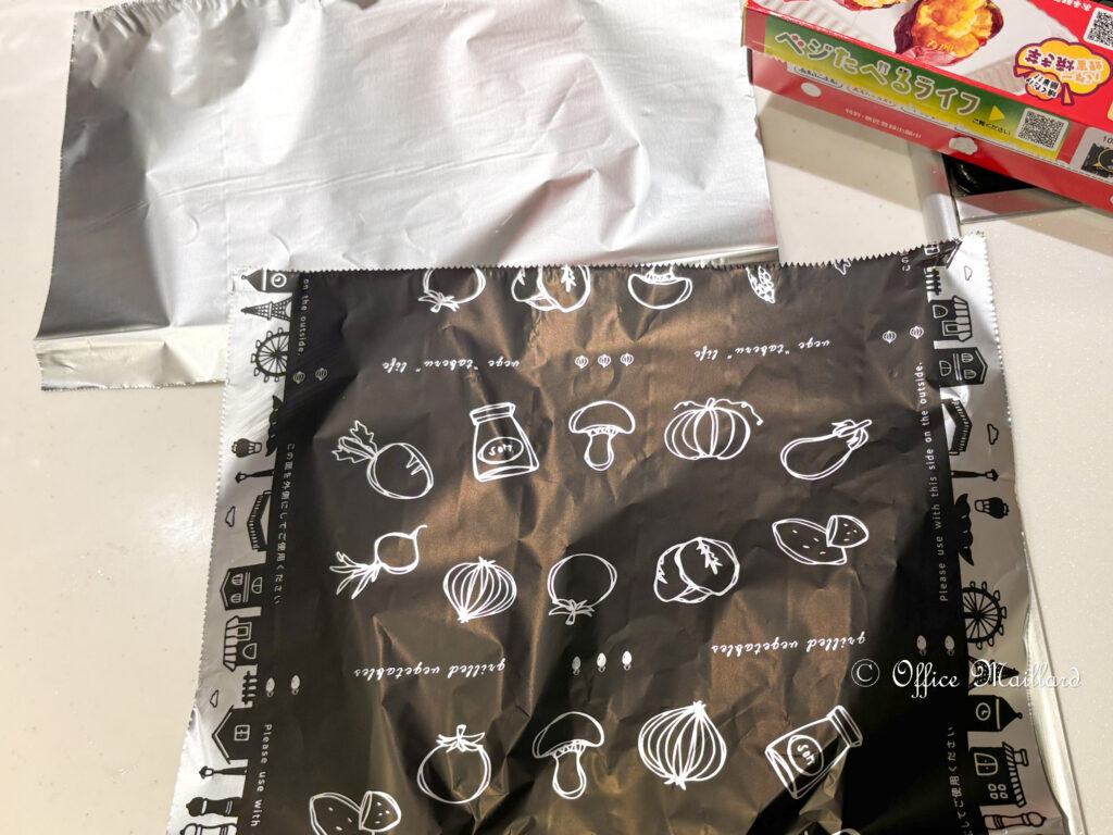 この黒い面を外側にして包んで焼きます。黒は熱を吸収しやすいので、ぴったり包むことでサツマイモに早く熱を伝え、時短になるというもの。