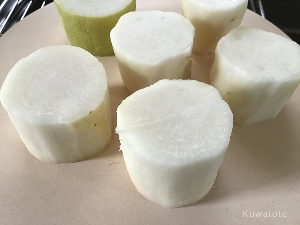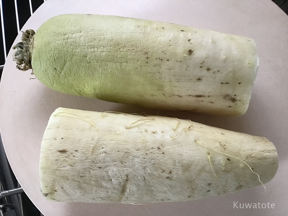 - 気が付いたら、写真のように黒い斑点ができていました。大根の色素が出たものかカビか判別がつかなかったので、皮をむいてから漬けることに。皮をむいたら中はキレイだったので安心☺