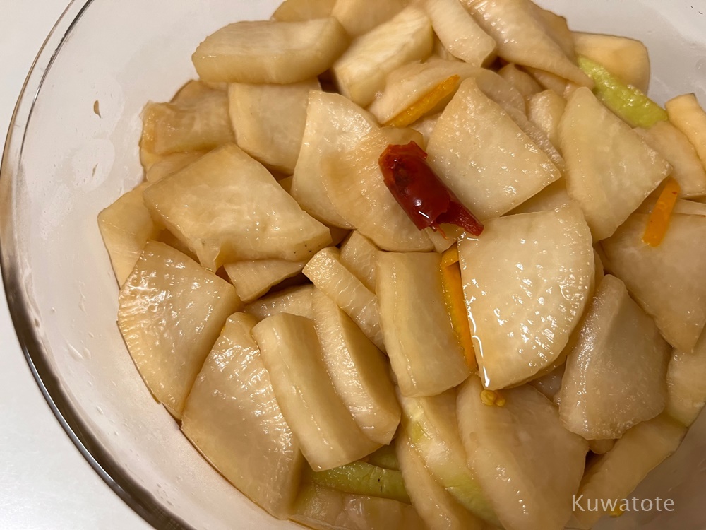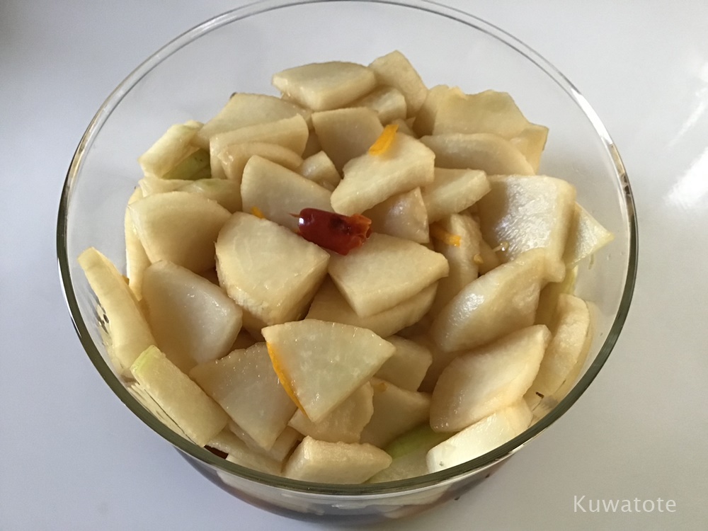 - 今回は薄めに切ってほんの軽く塩を振ってから、醤油、みりん、お酢を分量どおりで漬けました。味見をしたらほんの少しお醤油が足りなかったので足しました。辛いのが好きなので、唐辛子も種ごと入れました!
