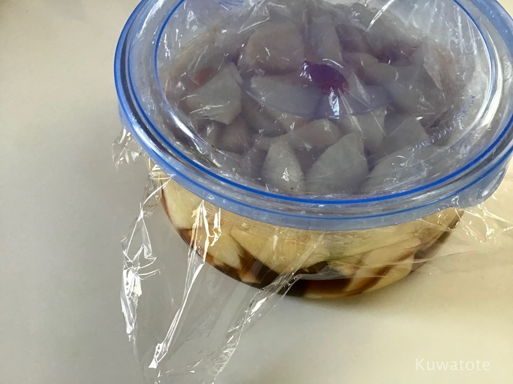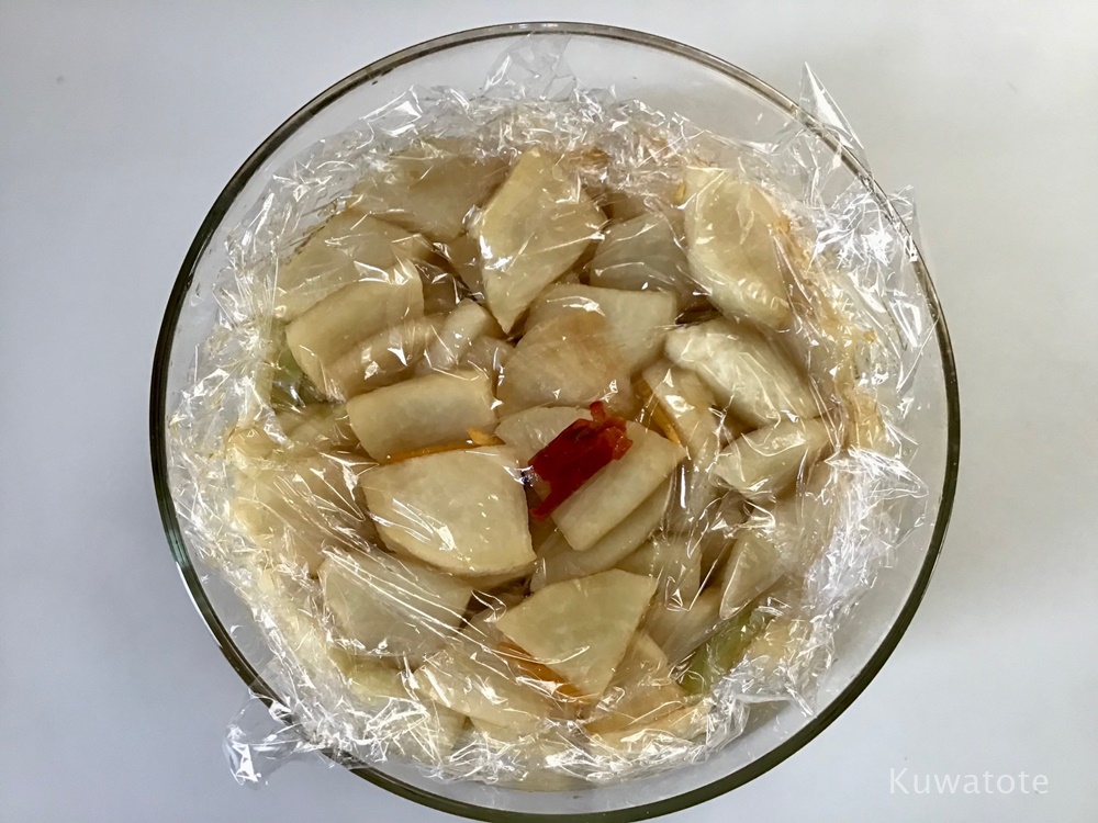 - 軽く和えてから、(漬物容器が無いので)保存用のガラス容器に移して、まずは落としラップで密着。その後上からもう1枚ラップをかけてフタをして30~1時間。味が染みて美味しかったです! by kaoru 2022.6.2