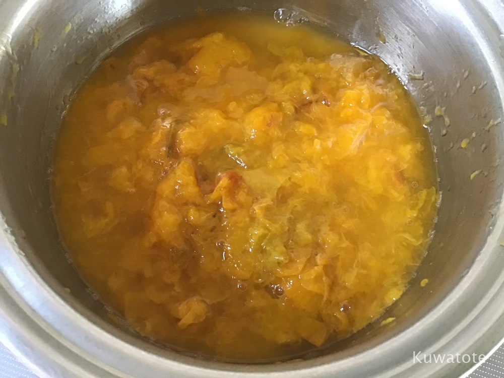 種を取って重さを量る。650g〜700gぐらいになっているので、果肉の60〜70%位のグラ二ュ―糖と果肉をお鍋に入れて弱火で煮詰める。